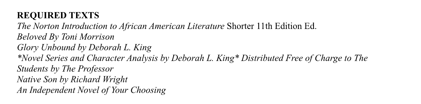 So, I just got the syllabus… and skweed some more. This is not a lightweight intro class at all… and the HUGE part? The class has three required texts: Beloved, by Toni Morrison; Glory Unbound by Me; and Native Son, by Richard Wright!!
